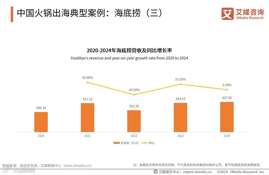 数据显示,2022-2024年海底捞总营收呈现稳步上升趋势,其中2024年海底捞营收达到427.55亿元,同比增长3.14%。艾媒咨询分析师认为,海外市场环境复杂多变,存在各种政治、经济、文化等风险。海底捞凭借较强的财务实力和品牌影响力,能够更好地应对市场波动、汇率变化等风险因素,减少外部环境对其海外业务的影响。