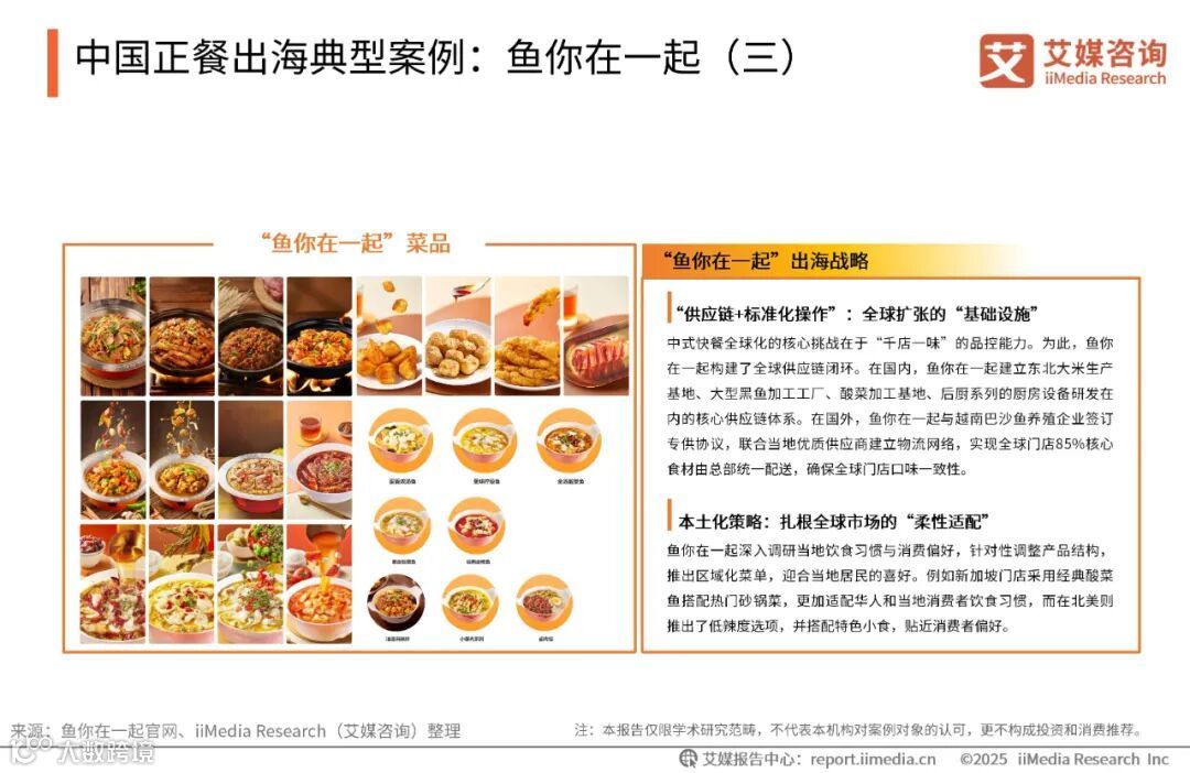 鱼你在一起出海战略聚焦供应链、标准化操作和本土化策略。其供应链实现全球布局,自建和投资关键供应体系,源头直采核心食材,借助数字化管理与冷链配送,保障食材新鲜和稳定供应。标准化操作方面,统一配送核心食材,规范流程,确保出品一致性和门店可复制性。本土化策略上,依市场需求调整产品,如北美低辣度选项和马来西亚酸辣风味,同时以 IP 形象和店铺设计提升品牌辨识度,融入当地文化。