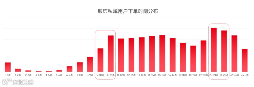 而从消费行为看,服饰私域用户上午10点左右和晚上8点以后下单会出现小高峰,这和服饰品上新、促销活动节奏基本保持一致。而在品牌门店打烊时间(晚上22:00-第2天早上9点),私域经营正在为服饰品牌带来更多“睡后收入”。