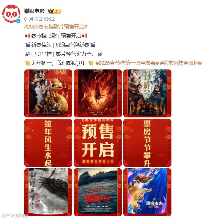 根据猫眼研究院的预测,2025年春节档电影票房有望突破84亿元。除了电影,各类文化演出、展览、庙会等活动也将吸引大量消费者,共同营造出浓厚的节日氛围。目前,2025年大年初一已开启“六强争霸”格局。《封神第二部:战火西岐》《射雕英雄传:侠之大者》《哪吒之魔童闹海》《唐探1900》《蛟龙行动》《熊出没·重启未来》均已官宣春节档上映。