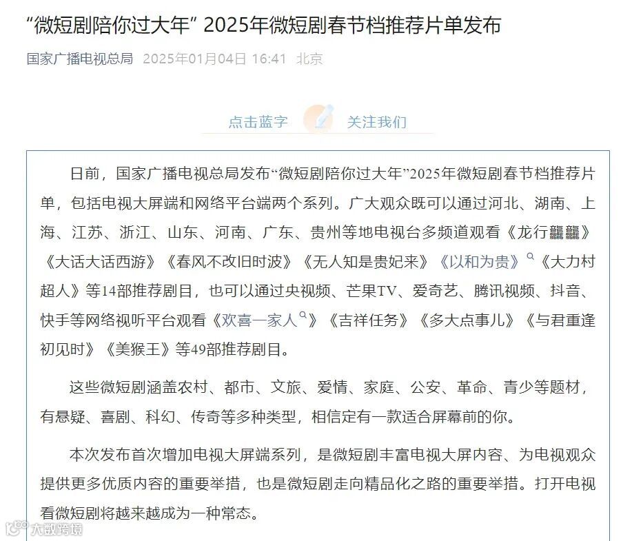 除了电影市场外,微短剧也成为春节期间文化消费的一大亮点。国家广播电视总局发布了“微短剧陪你过大年”2025年微短剧春节档推荐片单,为观众提供了更多元化的文化娱乐选择。这些微短剧以其精炼的剧情、独特的视角和贴近生活的题材,吸引了大量观众的关注和喜爱。