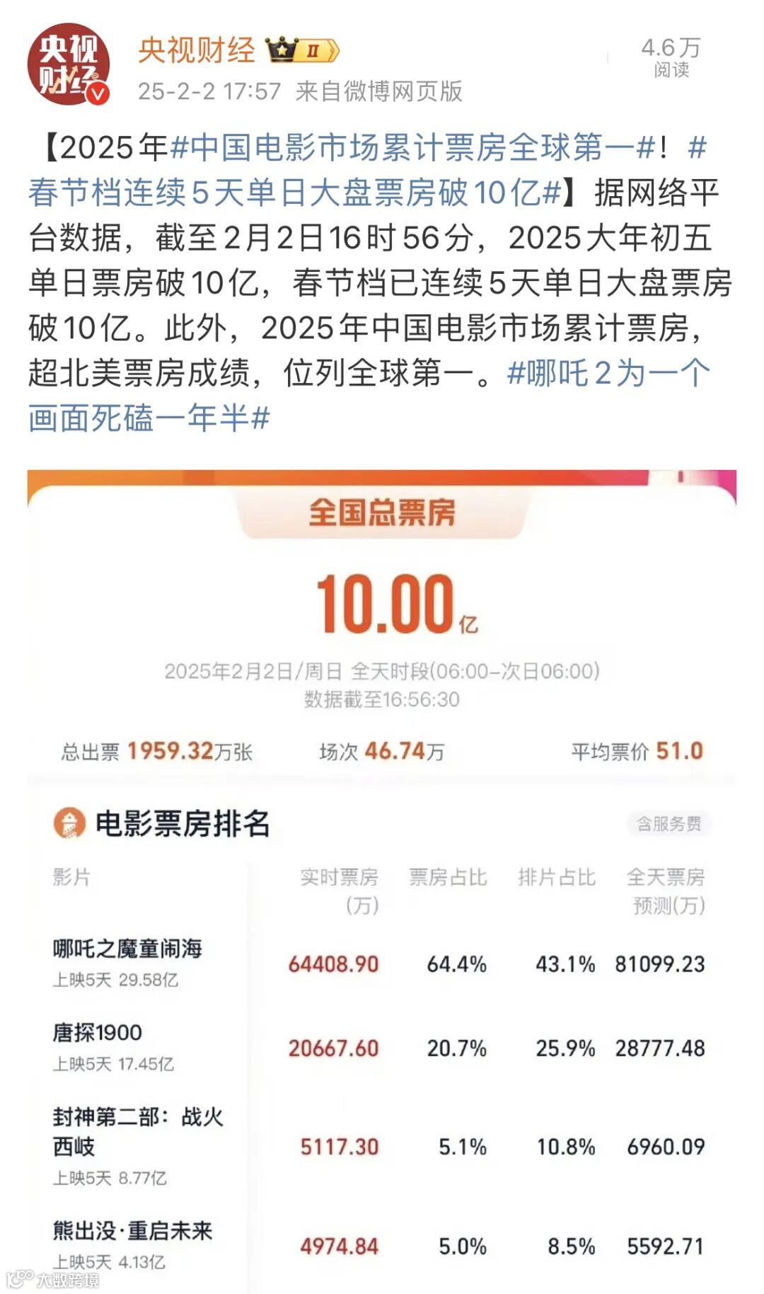 六部影片中有五部为IP系列化续作,“IP大战”成为蛇年春节档的特征。除了IP基础雄厚,类型丰富、特效含量高、主创票房号召力强、档期重要性加剧等几大因素,令业界看好今年春节档的市场表现。数据显示,截至2月2日16时56分,2025大年初五单日票房破10亿,春节档已连续5天单日大盘票房破10亿。