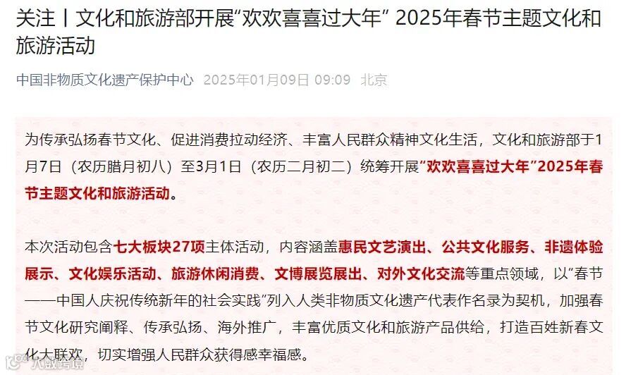 为了营造浓厚的春节文化氛围,文化和旅游部在“欢欢喜喜过大年”2025年春节主题文化和旅游活动中,特别增设了“文博馆里过大年”板块,着力打造“非遗馆里过大年”和“博物馆里过大年”两大品牌。在此期间,中国非遗馆及各地非遗馆、博物馆纷纷举办春节主题展览,推出了一系列特色陈列、文化教育和民俗体验活动,为游客提供了丰富多彩的节日体验。