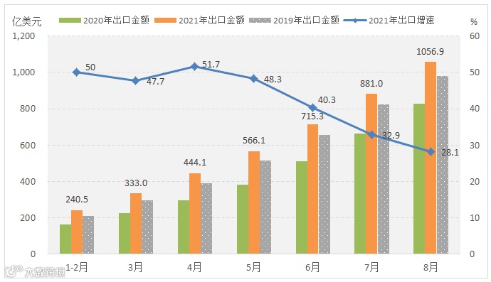 在国际市场需求回暖和海外订单回流等因素的拉动下,我国服装出口延续了2020年下半年以来快速恢复态势保持大幅增长。根据中国海关数据,2021年1-8月,我国累计完成服装及衣着附件出口1056.95亿美元,同比增长28.1%,两年平均增长5.6%。服装出口增速逐月放缓,8月单月增幅为8.7%,市场需求增长速度逐步回归常态化。