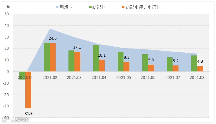 根据国家统计局数据,2021年1-8月,我国服装行业规模以上企业工业增加值同比增长9.9%,增速比上年同期回升21.3个百分点,比1-7月份回落0.5个百分点,两年平均下降1.3%;规模以上企业完成服装产量152.36亿件,同比增长12.85%,增速比上年同期回升24.8个百分点,比1-7月回落2.93个百分点,两年平均微降0.3%。
