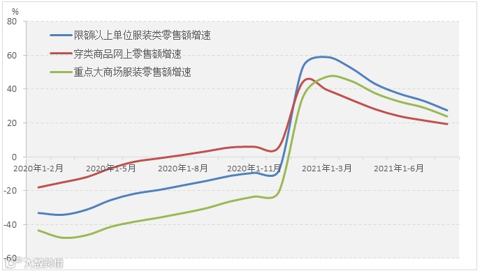 网络渠道增速放缓幅度略好于线下。根据国家统计局数据,2021年1-8 月,穿类商品网上零售额同比增长19.4%,增速较上年同期提高18.9个百分点,比1-7月回落2.2个百分点,两年平均增长9.9%。