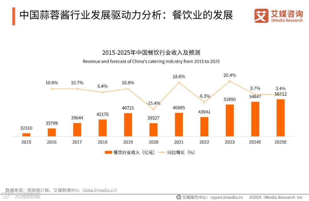 iiMedia Research(艾媒咨询)数据显示,2024年中国餐饮行业市场规模将达54847亿元,中国调味品市场规模将达6871亿元。得益于乡村大蒜产业的发展、食品工业化进程的加快、预制菜产业的迅猛发展与B端餐饮市场的不断壮大,餐企连锁化、出海趋势明显,进一步推动了调味品的需求增长,为蒜蓉酱细分市场的需求增长注入强劲动力。
