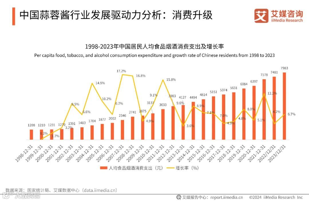 数据显示,2023年,中国居民人均食品烟酒消费支出7983元,增长6.7%,占人均消费支出的比重为29.8%。艾媒咨询分析师认为,在消费升级及快节奏生活的背景下,人们对于方便快捷、口味多样调味品的需求逐年增长,蒜蓉酱兼具蒜香、鲜蒜口感,不仅消费场景广泛,还能够开盖即食,能满足消费者的不同需求。