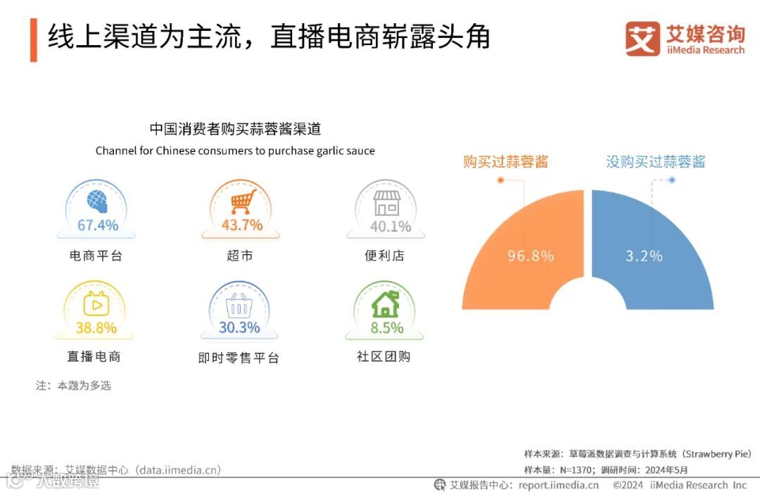 iiMedia Research(艾媒咨询)数据显示,绝大多数消费者(96.8%)有过购买蒜蓉酱的行为,显示蒜蓉酱在市场中的高普及率。在购买渠道方面,电商平台、超市、便利店、直播电商等是主要购买渠道。线下传统商超凭借其稳定的供应链和广泛的实体网络,仍然是消费者购物的主流选择。与此同时,电商平台尤其是直播电商凭借其独特的优势和创新的购物体验,正在迅速崛起并改变消费者的购物习惯。未来,这些购物渠道可能会进一步融合和互补,共同构建一个多元化、高效便捷的零售生态系统。
