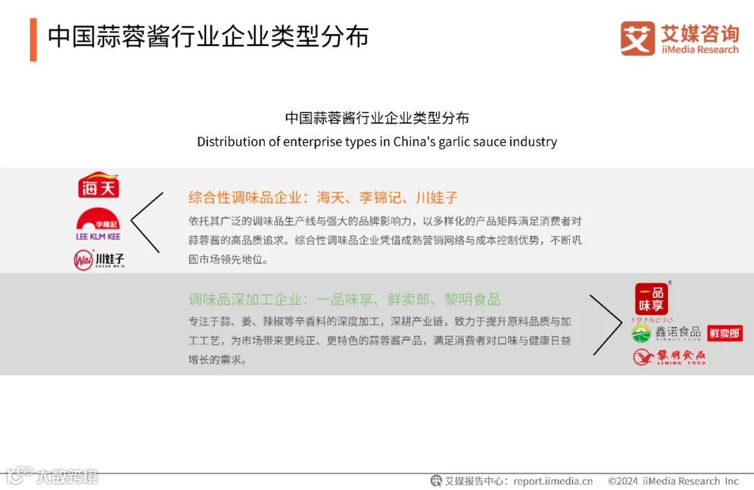 目前,入局蒜蓉酱市场的企业主要分为两种类型,其中包含以海天为代表的综合性调味品企业,以及以一品味享为代表的深耕蒜、姜、辣椒深加工制品企业。综合性调味料企业以规模和品牌为基石,拓宽市场边界;深耕型深加工企业则以专业和创新为驱动,深化产品内涵。