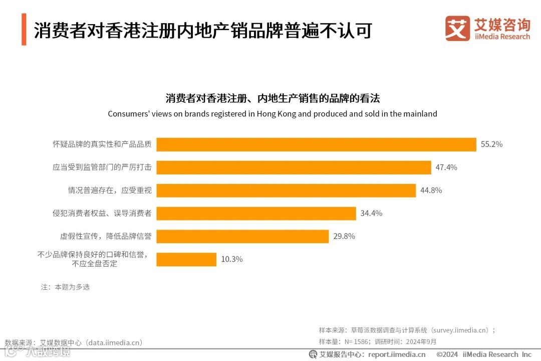 iiMedia Research(艾媒咨询)调研数据显示,对于宣传为香港品牌实则是在香港注册商标却只在内地生产、销售的一类品牌,55.2%的消费者怀疑品牌的真实性和产品品质,47.4%的消费者表示此类品牌应当受到监管部门的严厉打击,44.8%的消费者认为在香港注册商标却只在内地生产、销售的情况普遍存在,应受重视。仅凭在香港注册商标并不能真正代表该品牌是香港品牌,消费者期待监管部门的严厉打击和市场秩序的维护,相关部门和企业应当认真对待这一问题,采取有效措施来维护消费者权益。