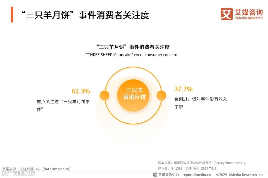 iiMedia Research(艾媒咨询)调研数据显示,消费者对“三只羊月饼”事件均有所关注,其中62.3%的消费者表示重点关注过“三只羊月饼”事件,37.7%的消费者表示看到过但没有深入了解。