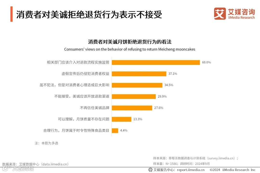 部分消费者质疑美诚月饼涉嫌虚假宣传,并表示申请退货遭到拒绝。iiMedia Research(艾媒咨询)调研数据显示,60.0%的消费者表示相关部门应该介入对退款流程实施监督,37.1%的消费者认为这是虚假宣传后仍侵犯消费者权益,34.5%的消费者认为美诚虽不犯法但对消费者心理造成巨大影响。尽管美诚公司回应目前在法律框架内并未直接触犯法律条款,但其“合法不合理”的行为正是当前社会经济活动中一个值得深思的问题,消费者期待有关部门能够整治这种不良现象。