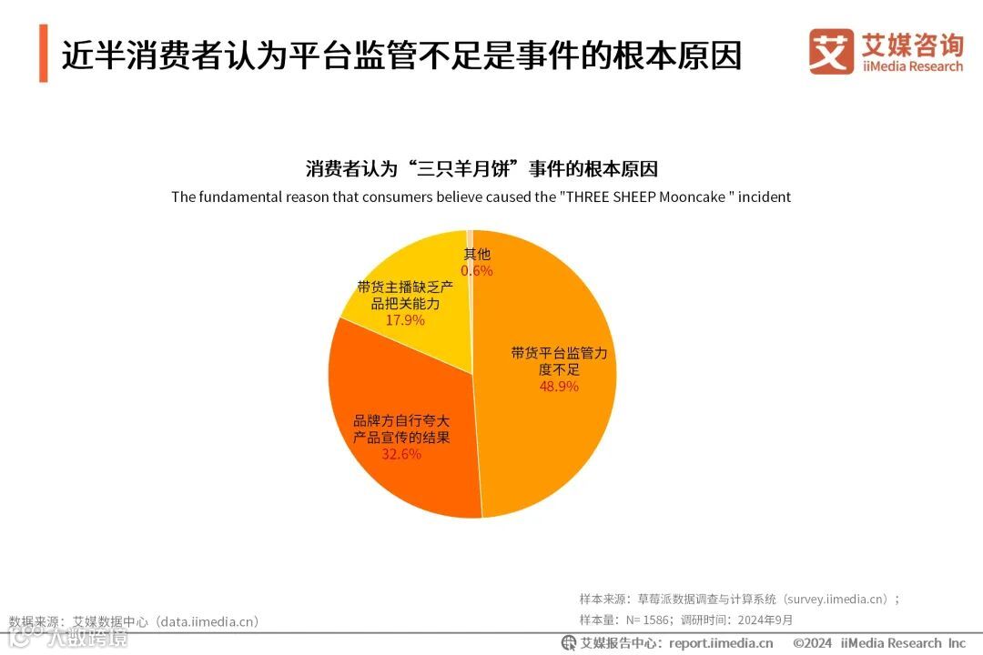 2024年9月12日,抖音头部主播疯狂小杨哥和三只羊旗下直播间售卖的香港美诚月饼被曝在香港买不到,“三只羊月饼”事件在各种媒体平台广泛传播,网友最关心的问题还是“香港美诚月饼”是否涉嫌“虚假宣传”。iiMedia Research(艾媒咨询)调研数据显示,对于三只羊在直播间使用“香港高端月饼”这一描述,用以介绍一款并非在香港地区销售的美诚月饼的行为,82.4%的消费者认为三只羊这种做法属于虚假宣传。在三只羊主播直播夸大宣传的争议中,48.9%的消费者认为带货平台监管力度不足是问题背后的根本原因,32.6%的消费者则将问题归咎于品牌方。直播电商经济快速发展,行业规模越来越大,但行业的发育水平、健康程度仍然不达预期。有关部门应从平台监管和主播两方面入手,推动行业健康发展,同时对涉嫌虚假宣传的商家进行查处,严厉打击“伪境外品牌”的乱象,营造一个公平、透明、健康的消费环境。