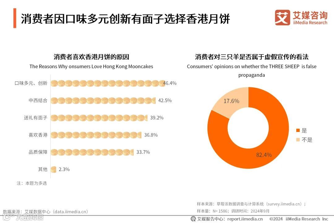 iiMedia Research(艾媒咨询)调研数据显示,46.4%的消费者喜欢香港月饼是因为其口味多元、创新,42.5%的消费者选择香港月饼是因为其中西结合的特点,39.2%的消费者表示香港月饼送礼有面子。对于三只羊在直播间使用“香港高端月饼”这一描述,用以介绍一款并非在香港地区销售的美诚月饼的行为,82.4%的消费者认为三只羊这种做法属于虚假宣传。