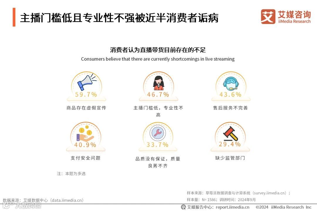 iiMedia Research(艾媒咨询)调研数据显示,商品存在虚假宣传(59.7%)是消费者在参与直播带货时最担忧的问题,其次,46.7%的消费者表示主播门槛低且专业性不强,43.6%的消费者认为直播带货售后服务不完善。随着直播带货行业的快速发展,监管滞后的问题日益凸显。政府和相关机构应加快制定和完善相关法规政策,明确监管主体和职责,提高主播的专业素养、准入门槛,以及加强对行业的规范和引导。