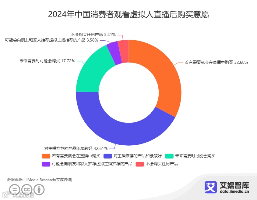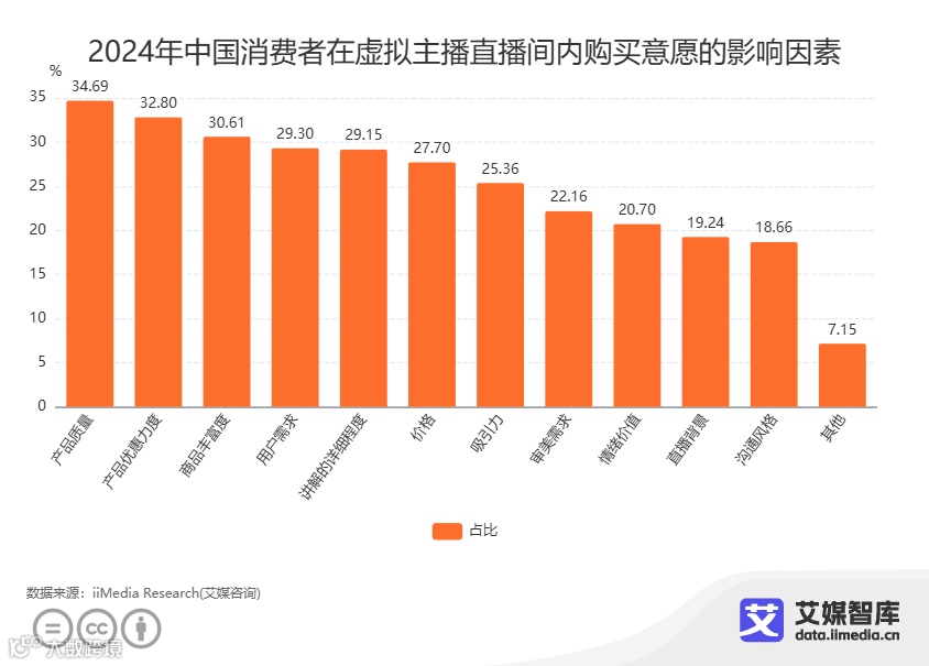但决定消费者购买的,不仅仅是因为虚拟人主播。iiMedia Research(艾媒咨询)调研数据显示,仅两成消费者认为虚拟主播会影响其对产品的购买意愿的。在消费者购买意愿的影响因素中,消费者最看重产品质量(34.69%),其次是产品优惠力度(32.80%)和商品的丰富度(30.61%)。