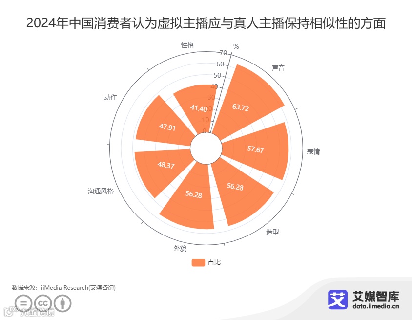 在虚拟主播应与真人主播保持相似性的方面中,声音、表情、造型以及外貌等方面的相似度是消费者最希望与真人接近的。消费者对于虚拟人直播在表情表达上的期待,他们希望虚拟主播能够更加生动、真实地展现情感。