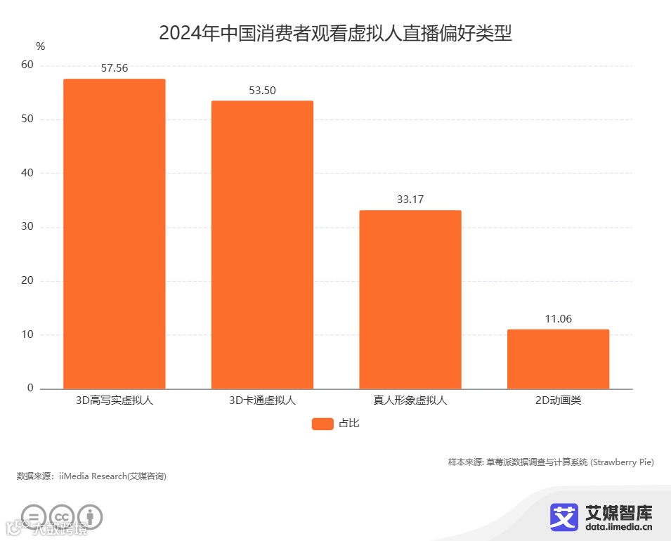 中国消费者偏好的虚拟人直播类型呈现出多样化特点。57.56%的消费者更偏好3D高写实虚拟人,53.50%的消费者更喜欢3D卡通虚拟人,33.17%的消费者喜欢真人形象虚拟人,11.06%的消费者喜欢2D动画类。