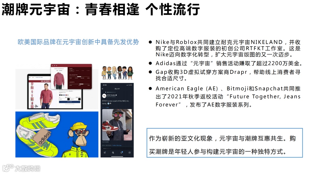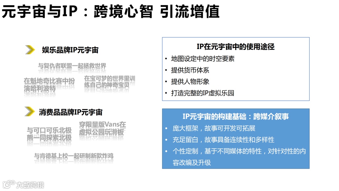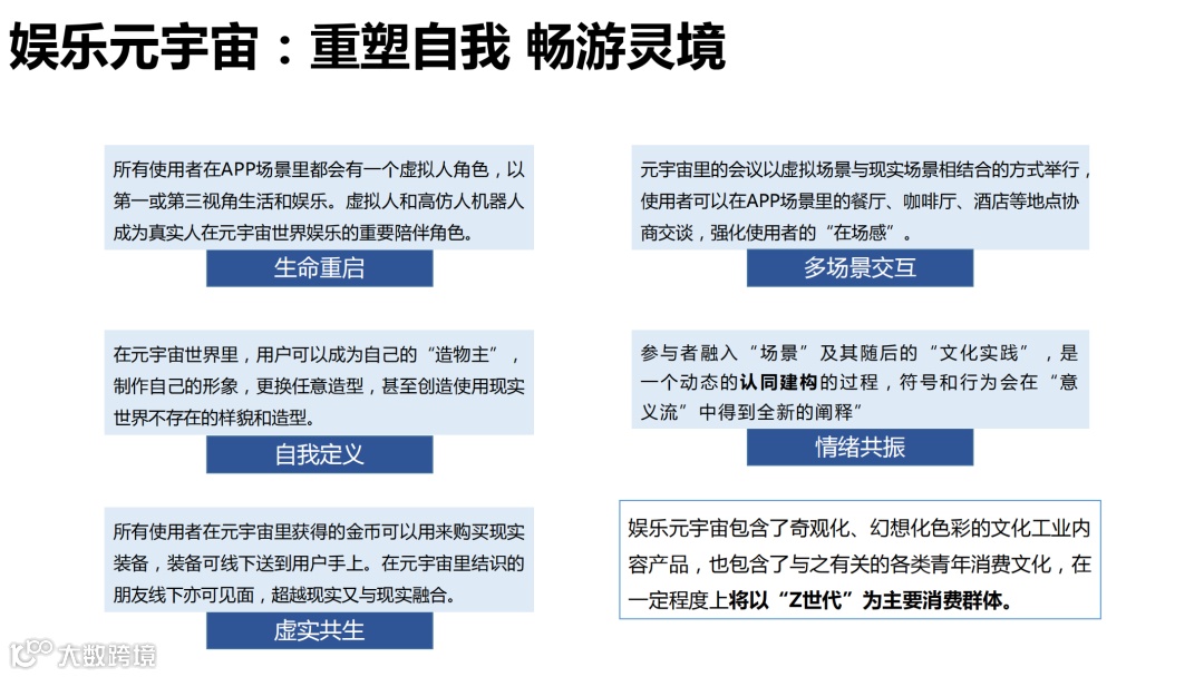 数字文娱产业中极具艺术性、体验性、技术性的数字资产, 与元宇宙中时空拓展、感官延伸、数字标识等技术特性的契合度颇高, 这也是文娱产业得以领跑元宇宙市场的重要原因。同时, 文娱产业对于I P 建立与塑造积累甚多,用户群体和粉丝基础都具有优势条件。