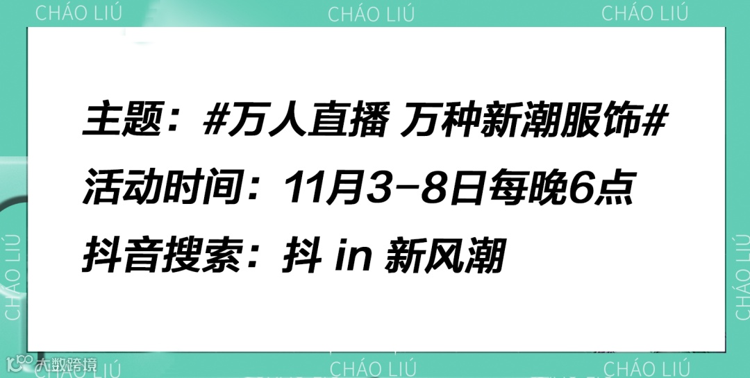 中国服装协会及CHIC联合抖音电商服饰官方直播间(账号名称:抖 in 新风潮)在今年双十一期间共同发起以#万人直播节#为主题的造节,打造国内电商第一档直播综艺!