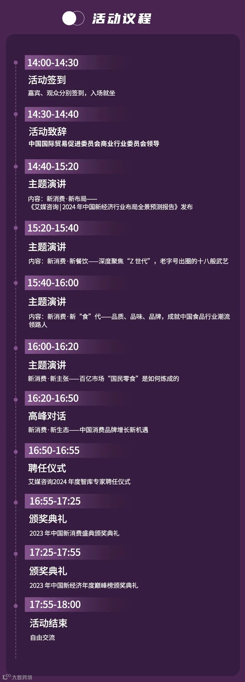 2024年1月12日,由全球新经济第三方数据挖掘和分析机构艾媒咨询(iiMedia Research)举办的“艾媒新消费盛典暨2024年中国消费趋势高峰论坛”将在广州南村万博举行。内容将包括《2024 年中国新经济行业布局全景预测报告》首发、行业大咖主题分享、圆桌对话、新消费颁奖典礼等,1000+行业人士聚会、300万+媒体曝光!