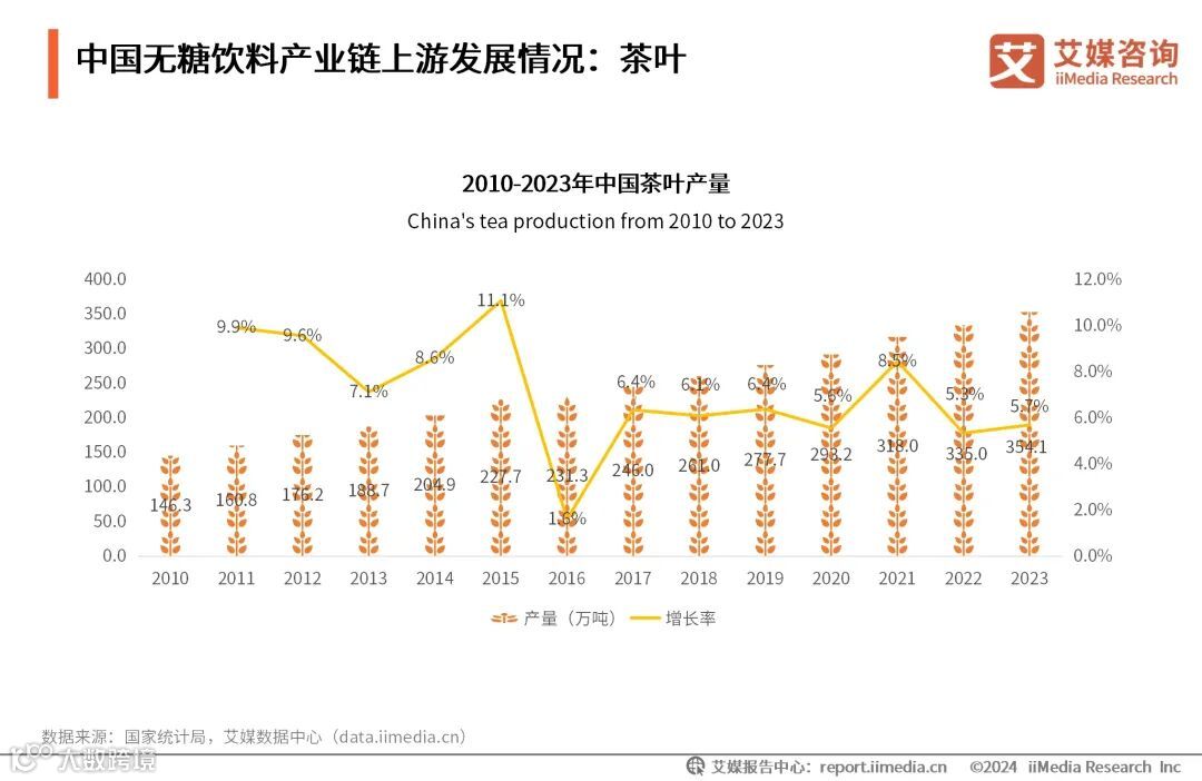 茶叶作为天然的健康饮品,具有广大的消费群体,近年成为中国无糖饮料重要生产原料。数据显示,2023年中国茶叶产量已达到354.1万吨,同比增长5.7%。艾媒咨询分析师认为,“茶文化”在中国源远流长,无糖茶饮成为无糖饮料抢占市场的一个重要切入点。总体而言,需求拉动供应端增长,茶叶生产情况相对稳定,无糖饮料原材料供给得到保障。