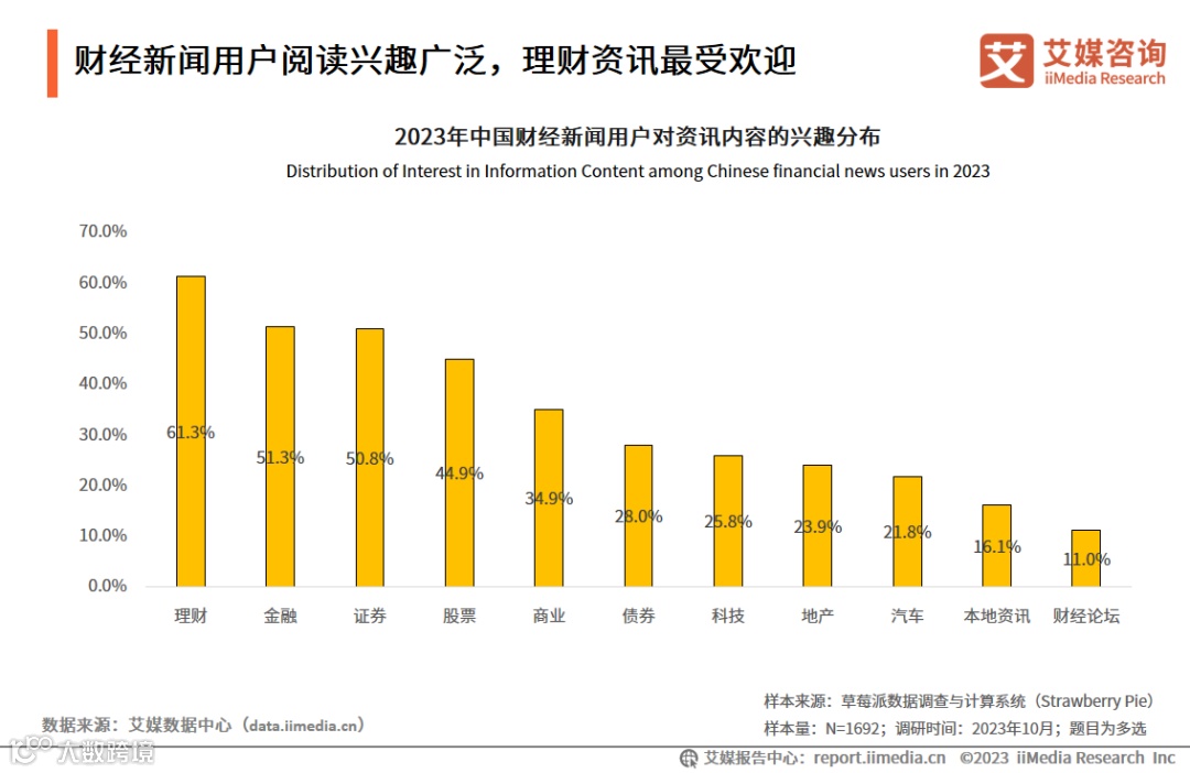 iiMedia Research(艾媒咨询)数据显示,在诸多财经资讯中,中国财经新闻用户对理财资讯(61.3%)更加关注。艾媒咨询分析师认为,投资理财知识能够帮助人们更加理性地管理自身财务,而财经媒体是大众获取这类知识的重要途径。随着理财观念逐渐在年轻人中普及,财经媒体的年轻用户数量也在不断增长。