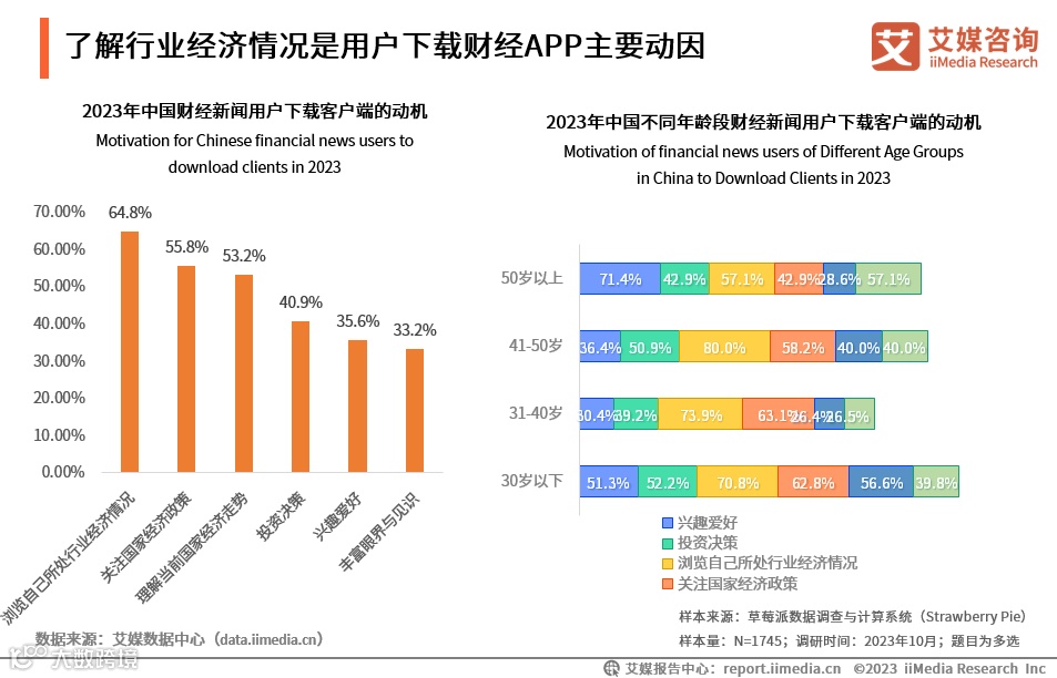 iiMedia Research(艾媒咨询)数据显示,2023年中国财经新闻用户下载客户端的主要动机是浏览自己所处行业经济情况(64.8%),其次是关注国家经济政策(55.8%)。其中,在各年龄层中,客户端下载动机是投资决策的用户以年轻群体为主,占比达52.2%,其次是41-50岁消费能力较强的人群,占比为50.9%。艾媒咨询分析师认为,关注行业经济动向与职业生涯可持续发展息息相关,对行业经济形势的解读资讯能够最大限度延展用户范围。