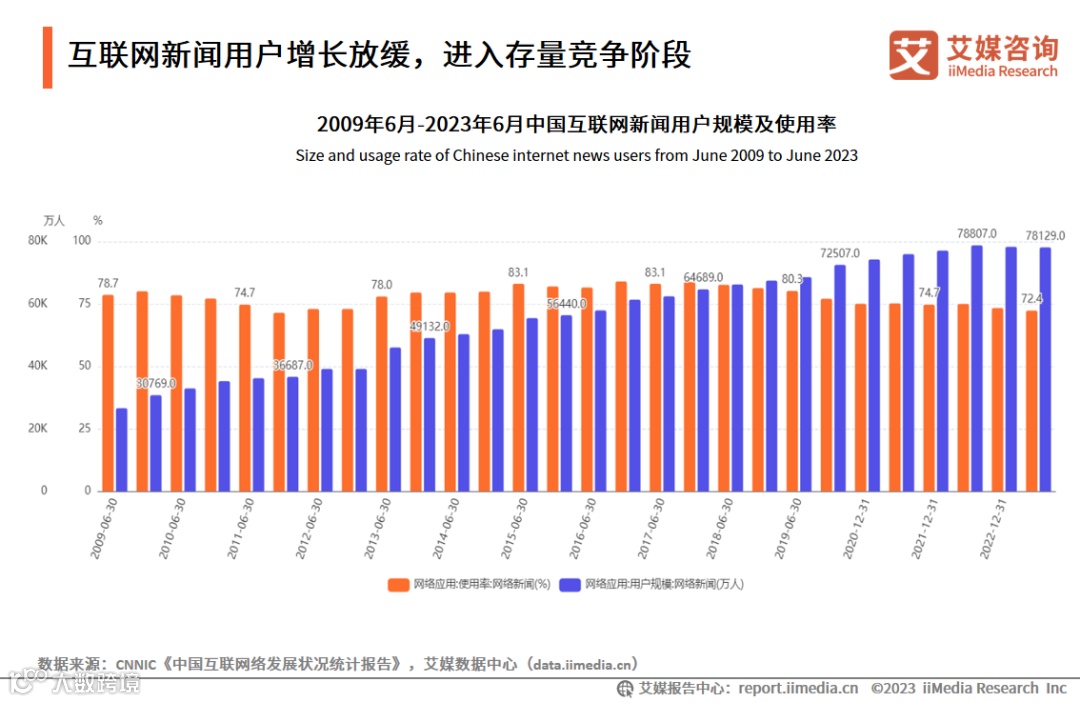 数据显示,截至2023年6月,中国互联网用户规模已达10.79亿人,网民使用手机上网的比例达99.8%。中国互联网新闻用户规模达到7.81亿,占网民整体的72.4%。随着中国移动互联网的迅速普及与发展,用户规模已进入存量竞争阶段,媒体平台需要不断创新和改进,以适应市场的变化和用户的需求。