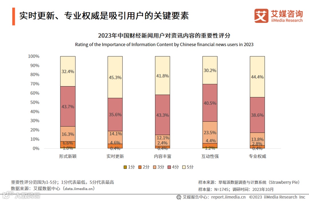 iiMedia Research(艾媒咨询)数据显示,2023年中国财经新闻用户对财经资讯的及时性较为关注,认为实时更新重要性为5分的占比达45.3%,其次是专业权威(44.4%)以及内容丰富(41.8%)。艾媒咨询分析师认为,资讯的实时更新能够以时间占位换流量优势,在供给频次上的优化,能够加快形成高覆盖的强势传播效应。目前,已有多家财经媒体采用“7x24资讯”或24小时AI直播等形式提升更新频率。
