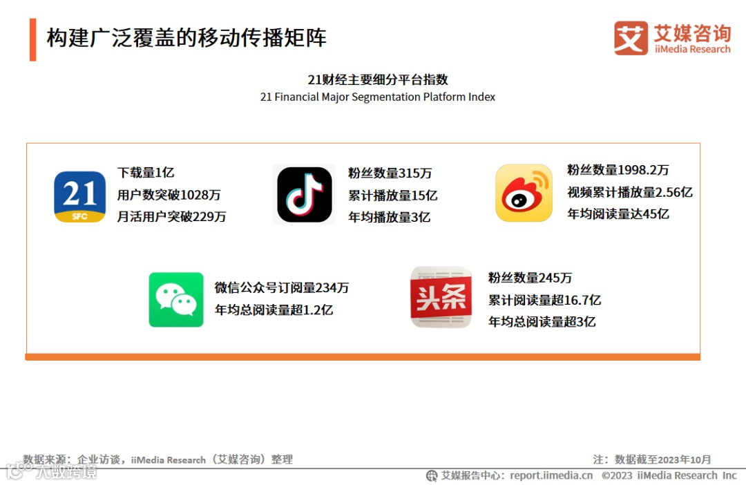 南财集团紧跟互联网内容传播形式的发展节奏,作为集团的旗舰媒体,《21世纪经济报道》积极布局直播、短视频、H5等新内容形式。截至2023年10月,21财经APP累计下载量突破1亿,用户数超千万,综合影响力常年稳居主流财经类客户端前列。2022年10月28日,国家互联网信息办公室公开发布第二批境内金融信息服务机构名单,21财经(APP)“VIP”板块位列其中。