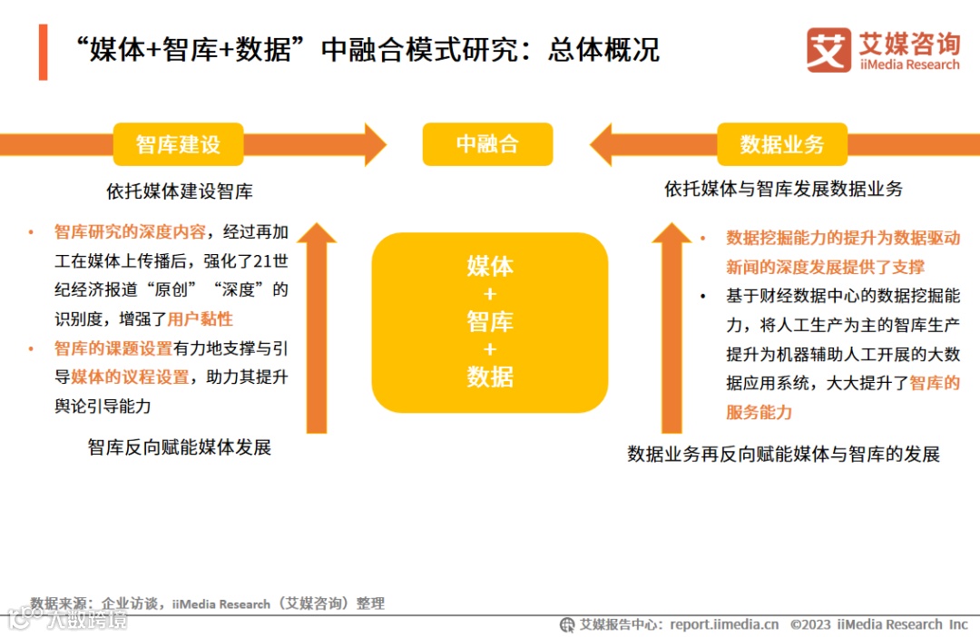 传统媒体与新兴媒体一体化发展的“小融合”,初步解决了传统媒体在移动互联时代影响力稳步提升的问题,使得新媒体收入成为《21世纪经济报道》的第一收入支柱。针对2022年以来新媒体收入放缓以及信息过度泛滥与高质量的内容供给不足、搜索成本过高并存的结构性矛盾等问题,《21世纪经济报道》以纳入南财集团为契机,走出“媒体+智库+数据”的一体化进阶道路。