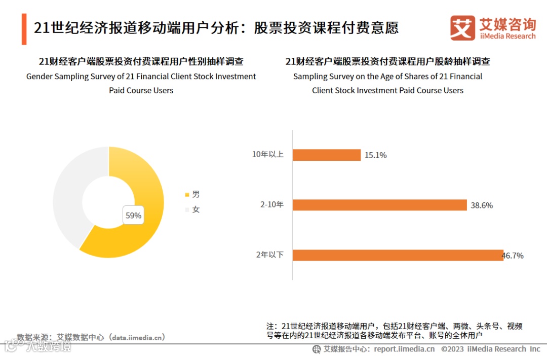 21财经客户端对股票投资付费课程用户的抽样调查数据显示,股票投资课程付费男性用户占比较高,达59%;2-10年股龄具有一定的经济储备或者金融从业经验的用户对内容的认可度和付费意愿较高,2年以下投资的投资者付费意愿最高。
