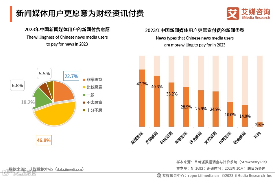 iiMedia Research(艾媒咨询)数据显示,2023年中国新闻媒体用户付费阅读意愿较高,愿意为新闻付费的用户占比达69.5%。其中,用户对财经新闻(47.7%)以及法律新闻(40.3%)等功能性更强的新闻类型付费意愿更高。艾媒咨询分析师认为,用户“免费阅读”的观念根深蒂固,功能性、专业性成为付费阅读的杠杆。
