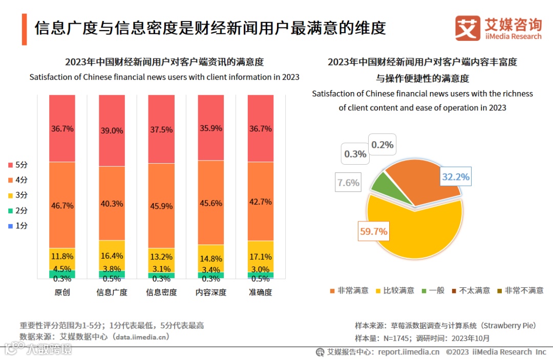 iiMedia Research(艾媒咨询)数据显示,2023年中国财经新闻用户对客户端资讯满意度整体较高,其中满意度最高的是信息广度(39.0%)以及信息密度(37.5%)两个维度。在客户端整体内容丰富度以及操作便捷性层面,用户满意度超9成(91.9%)。艾媒咨询分析师认为,在衡量财经客户端内容资讯满意度的指标中,各项指标用户平均满意度均超过4分,凭借多年专业媒体内容输出能力,财经新闻客户端取得了用户较高的认可度。