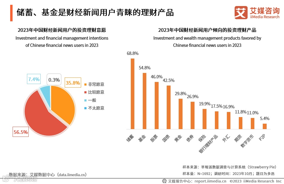 iiMedia Research(艾媒咨询)数据显示,2023年投资意愿强烈的财经新闻用户占比为92.3%。财经新闻用户通常更加青睐稳健的储蓄(68.8%)产品以及入场门槛较低的基金类(54.8%)产品。艾媒咨询分析师认为,目前低波稳健型理财产品更受青睐,随着基金市场的不断扩大和投资方式的多样化,更多投资者选择通过基金投资分散风险。
