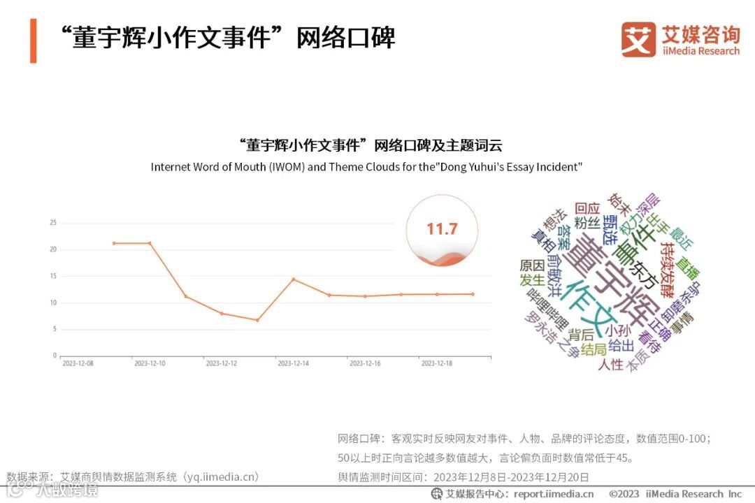 iiMedia Research(艾媒咨询)数据显示,自12月9日起,“董宇辉小作文事件”网络口碑偏向负面,整体呈下降趋势。12月10日-12月13日,事件舆论发酵,网络口碑出现明显下滑;12月14日,东方甄选进行积极处理,使网络口碑有一定的回升;而后随着事件的平息,网络口碑渐趋平缓。截至12月20日,“董宇辉小作文事件”网络口碑已降至11.7。网友就“董宇辉”、“作文”、“东方甄选”及“俞敏洪”四个方面展开的讨论及争议最多。