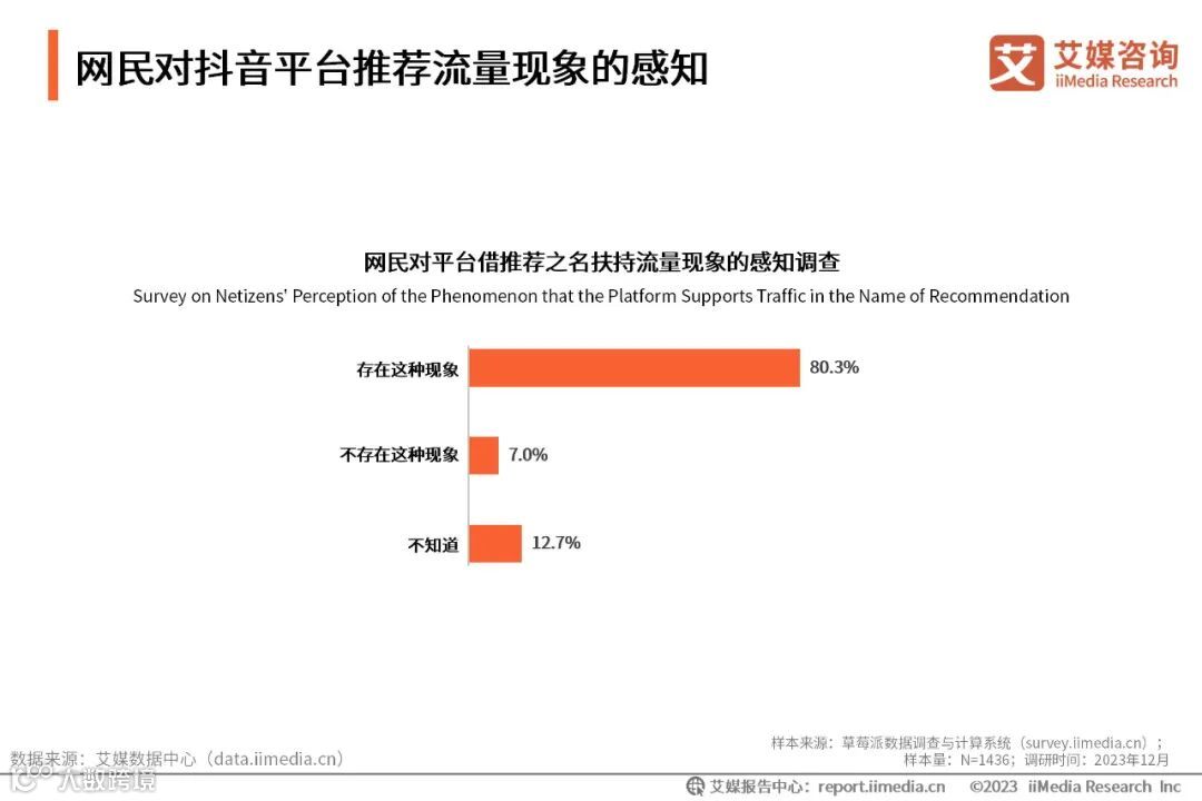 iiMedia Research(艾媒咨询)数据显示,80.3%的受访者认为平台是流量的重要推手,存在平台借推荐算法的名义进行流量扶持的行为;而7.0%的受访者则明确表示不存在。艾媒咨询分析师认为,当前大众普遍认为平台存在借推荐之名扶持流量的现象,这会导致平台公信力的下降,为了改变这一状况,平台方应该提供更多关于推荐算法的信息,并赋予大众更多的浏览内容选择权,通过透明化的推荐机制恢复大众的信任。