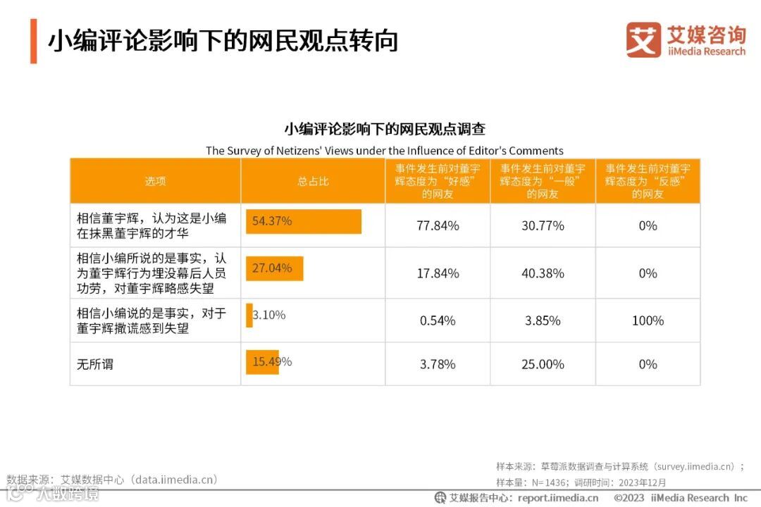iiMedia Research(艾媒咨询)调研数据显示,当看到小编评论说小作文是团队共同努力的结果时,54.37%的受访者认为小编抹黑董宇辉才华,选择相信董宇辉;但也有30.14%的网友相信小编所言,对董宇辉持有失望情绪。结合事件发生前对董宇辉的好感度调查进行分析,事件发生前对董宇辉好感度一般的网友有44.23%转变为失望态度。艾媒咨询分析师认为,小编评论对董宇辉形象有负面影响,尤其对于事前好感度一般的网友来说,这种影响更加明显。