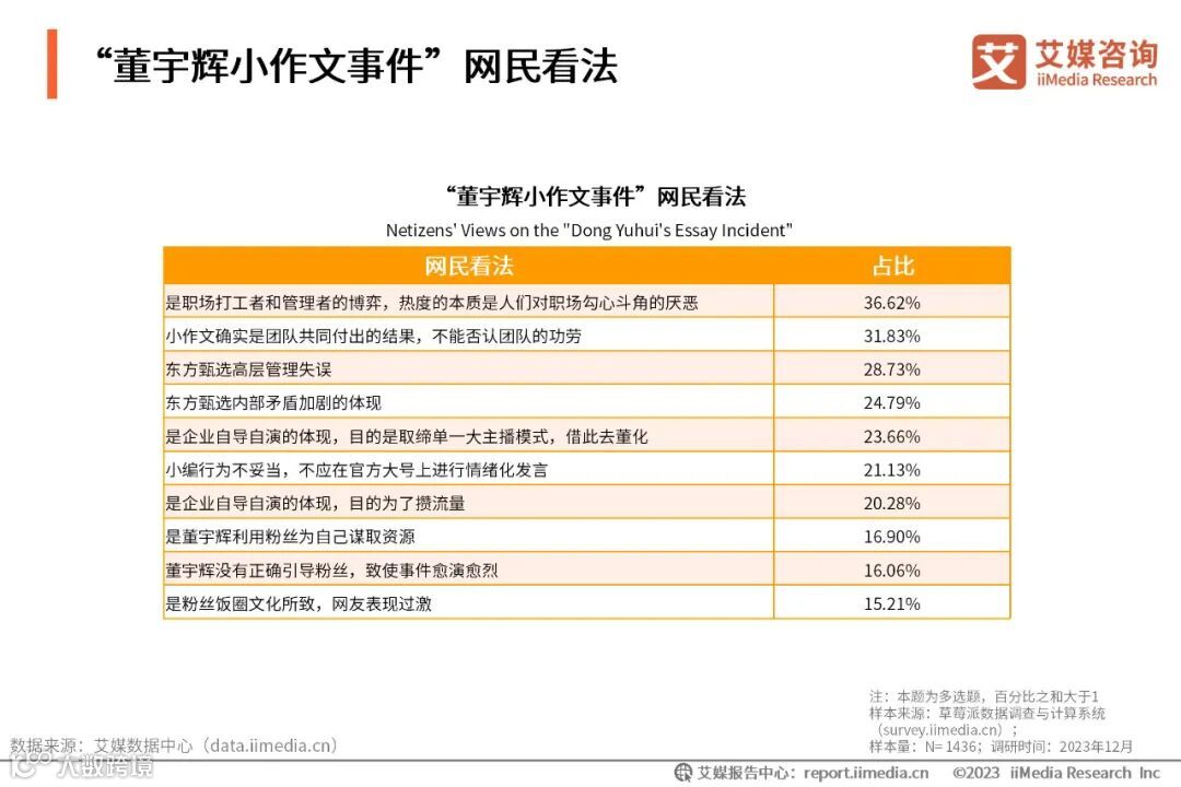 iiMedia Research(艾媒咨询)调研数据显示,在“董宇辉小作文事件”中,网民看法各异,包括针对企业、粉丝、董宇辉和小编等方面的观点。36.62%的网友认为此事件热度的本质是人们对职场勾心斗角的厌恶,31.83%的网友则坚持不能否认团队的功劳。关于事件的起因,21.13%的网友认为是小编的情绪化发言直接造成的,深层次上,较多网友倾向于是企业管理或自导自演的问题,部分网友认为董宇辉本身也有过失,还有部分网友指出粉丝表现过激。