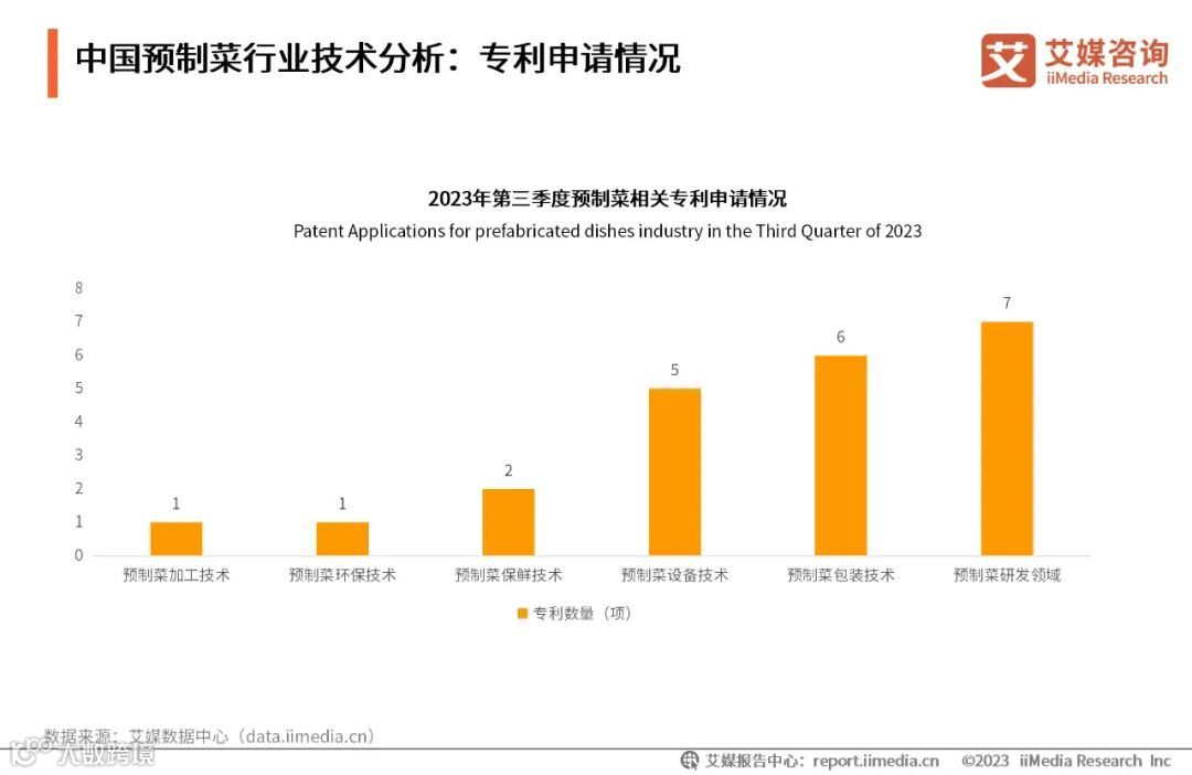 2023年第三季度,预制菜相关专利共申请22项,其中31.8%专利集中在预制菜研发领域,即某细分品类预制菜的创新及其制备工艺;其次是预制菜包装技术,以及设备创新技术,如冲洗一体机、风干设备等,占比分别为27.3%以及22.7%。艾媒咨询分析师认为,目前各创新主体的专利申请量并不多,且缺乏系统的布局、龙头企业和核心工艺技术,仍以传统加工技术创新为主,新的专利技术尚较为缺失。