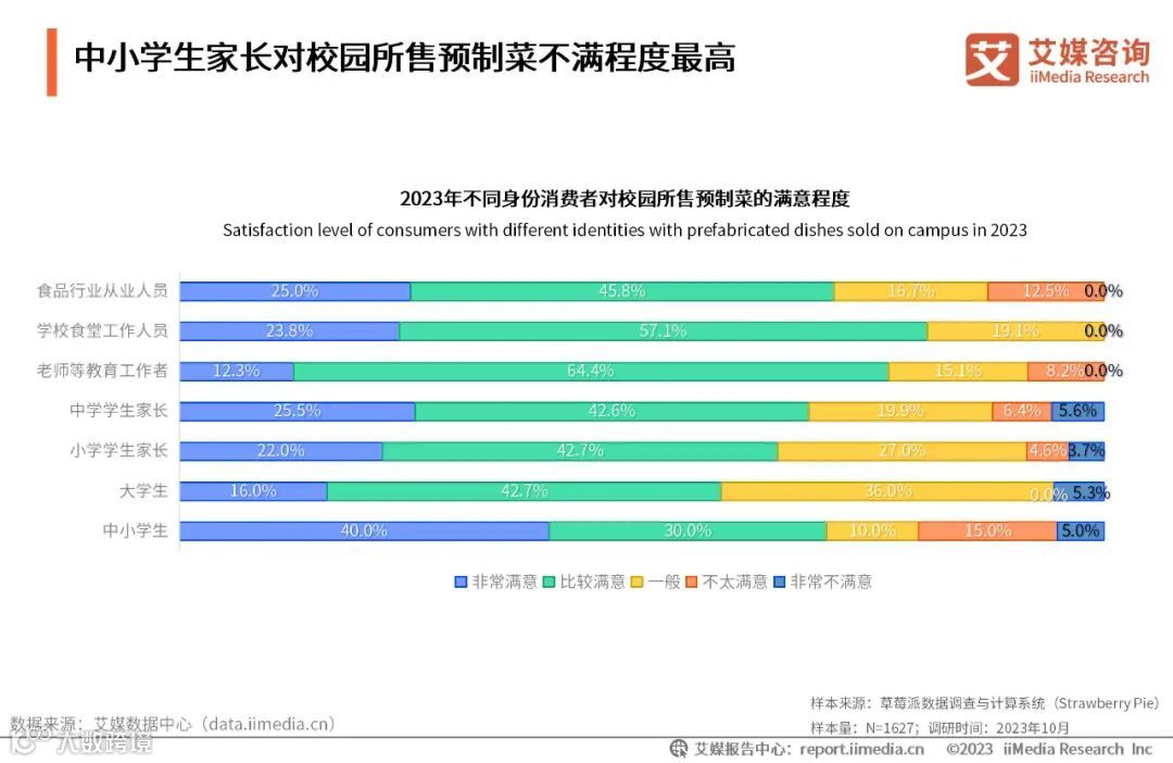 iiMedia Research(艾媒咨询)数据显示,2023年中学及小学生家长对校园所售预制菜不满程度最高,选择“非常不满意”的比例分别为5.6%以及3.7%。大学生对校园所售预制菜不满程度同样较高,持中立态度的学生比例为36%。