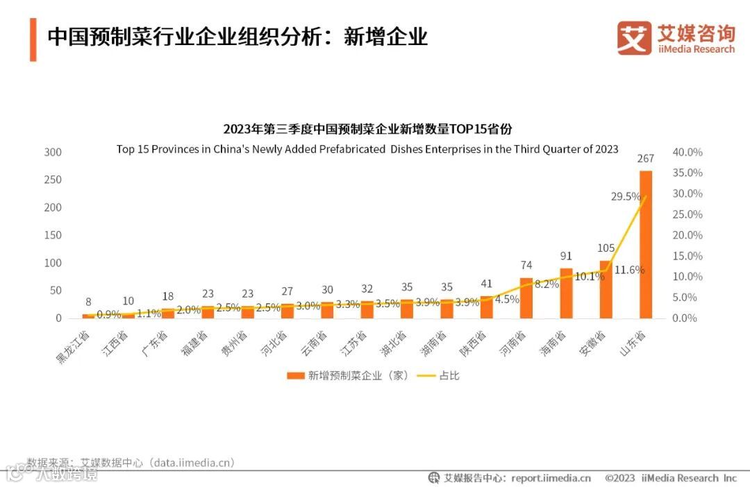 iiMedia Research(艾媒咨询)数据显示,2023年第三季度,中国新增预制菜企业905家,其中山东省新增预制菜企业数量最多,占比达29.5%。艾媒咨询分析师认为,目前预制菜新增企业仍普遍分布在沿海省份。随着预制菜全产业链高质量发展,中部地区如安徽省、河南省等具有较强影响力,推动中部地区成为全国食品产业版图的重要一极。