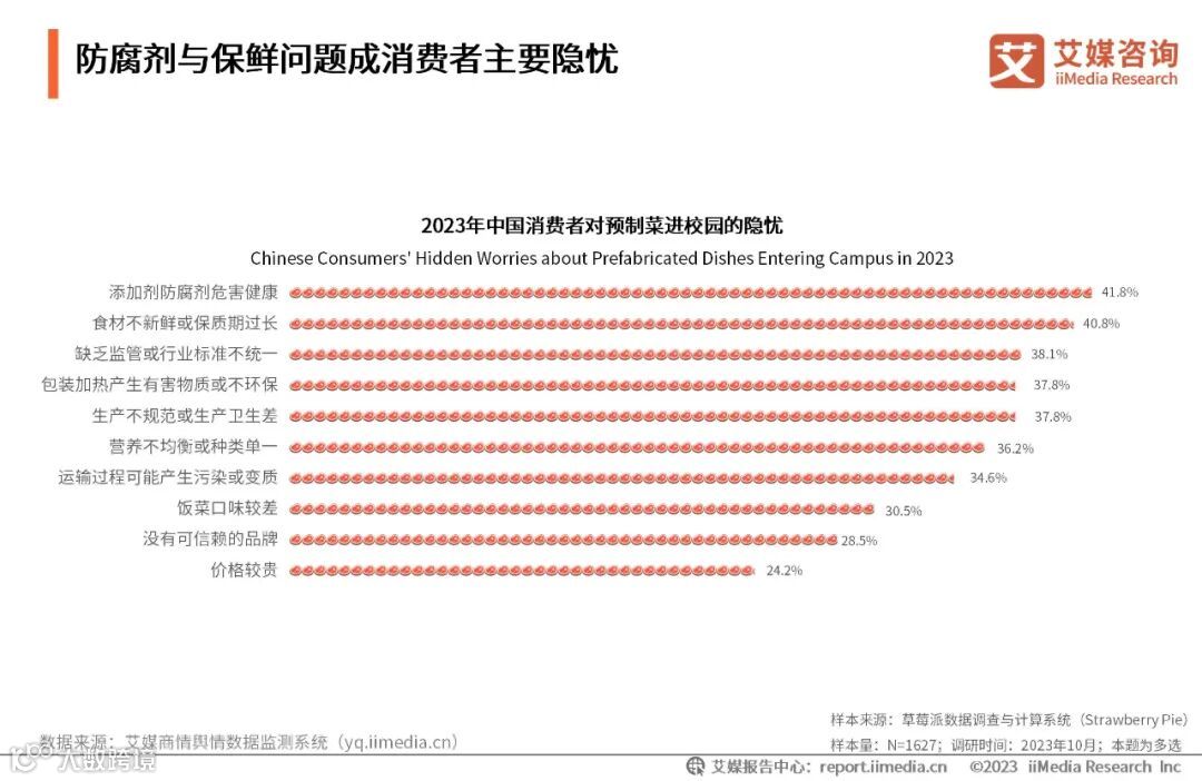 iiMedia Research(艾媒咨询)数据显示,2023年中国消费者对预制菜进校园的主要隐忧较为分散,最为突出的是担心预制菜添加防腐剂危害人体身体健康(41.8%),其次是担心食材不健康或保质期过长(40.8%)、缺乏监管或行业标准不统一(38.1%)。艾媒咨询分析师认为,目前预制菜暂未能解决不添加防腐剂而能使食物保持新鲜的问题,因此一方面应制定防腐剂的添加标准;另一方面应发展可以取代防腐剂的食品保鲜新技术以及快速冷链技术,处理好保鲜和安全的矛盾。