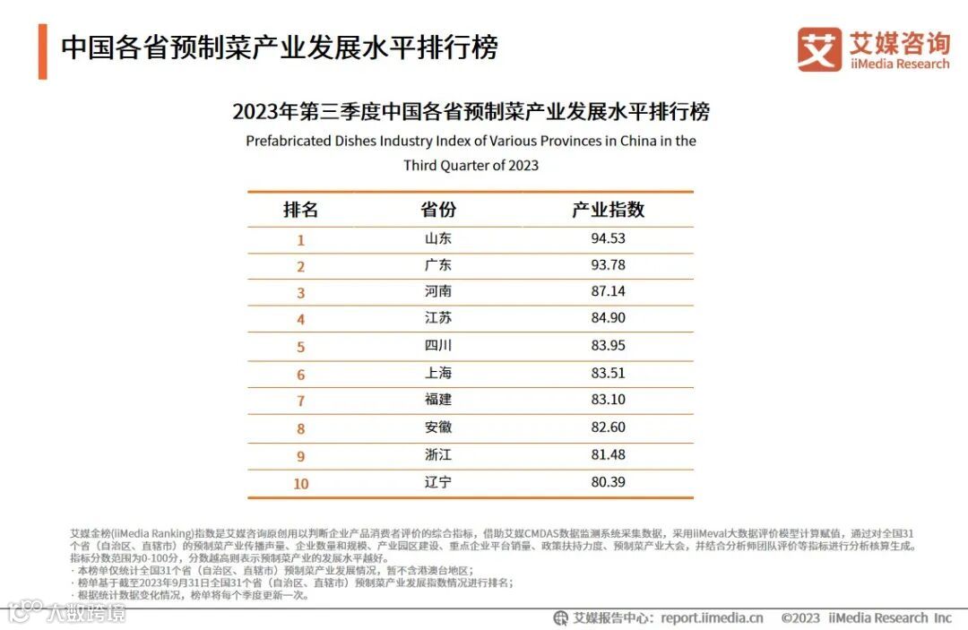 iiMedia Ranking(艾媒金榜)数据显示,2023年第三季度中国各省预制菜产业发展水平前10名分别是:山东、广东、河南、江苏、四川、上海、福建、安徽、浙江、辽宁。与《2023年第二季度中国各省份预制菜产业发展水平排行榜》相比,山东(94.53)晋升至榜首,浙江(81.48)、辽宁(80.39)进入到榜单前十名,陕西(78.98)上升到第15名。