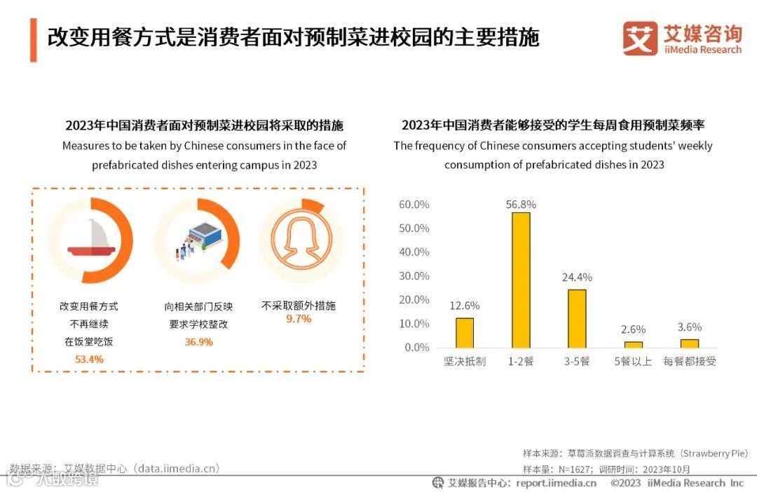 iiMedia Research(艾媒咨询)数据显示,面对预制菜进校园,53.4%消费者选择改变用餐方式,不再继续在饭堂吃饭,此外36.9%消费者选择向有关部门反映。消费者能够接受学生一周内食用1-2餐预制菜的占比达56.8%。