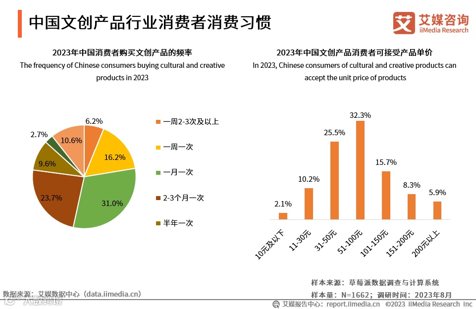 iiMedia Research(艾媒咨询)数据显示,中国文创产品消费者的购买频次主要为一月一次,占比为31.0%,其次为2-3个月一次,占比为23.7%;超三成消费者可接受的产品单价为51-100元,文创产品的总体消费处于中等水平区间。