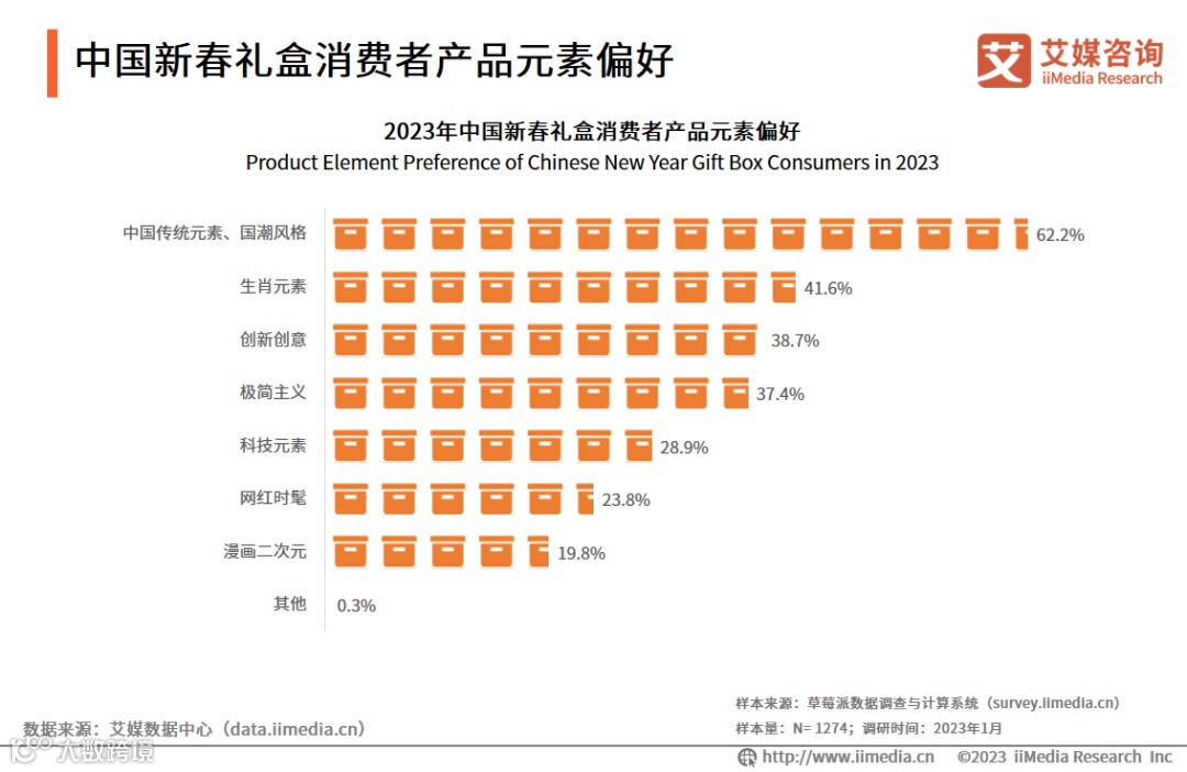 调研数据显示,中国传统元素、国潮风格是中国新春礼盒消费者选择最多的产品元素,占62.2%。偏好度排名第二、三的产品元素分别为生肖元素(41.6%)和创新创意(38.7%)。艾媒咨询分析师认为,春节期间人们会按照传统习俗制作地方传统美食和开展布袋戏表演等传统活动,传统文化氛围更加浓厚,人们也更偏好于中国风元素。此外,创新创意、极简主义等元素也开始吸引人们的目光。