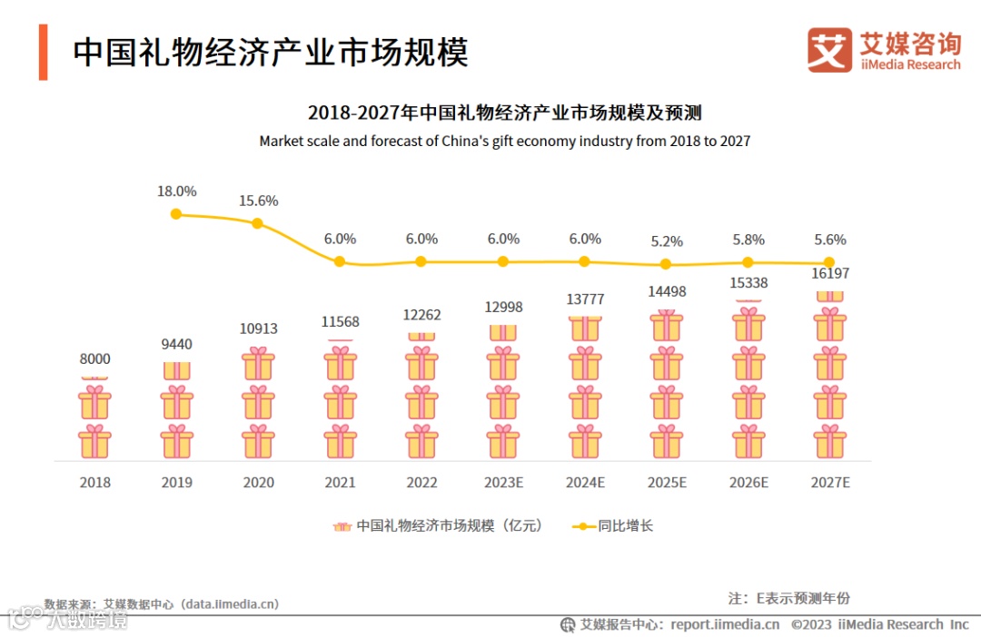 iiMedia Research(艾媒咨询)数据显示,2018-2022年中国礼物经济产业市场规模从8000亿元增至12262亿元,呈逐年递增趋势;预计2024年中国礼物经济市场规模将达13777亿元,2027年达16197亿元。艾媒咨询分析师认为,随着中国礼物经济产业的逐渐增长,未来将吸引更多的市场参与者关注。
